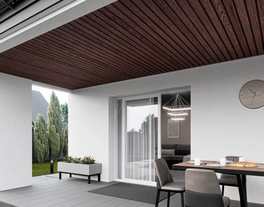 Помимо функций защиты и вентиляции, софиты помогают завершить внешний вид здания, скрывая места перехода от вертикальных поверхностей к горизонтальным. Полуматовая поверхность и текстура софитов реалистично имитируют натуральное дерево.